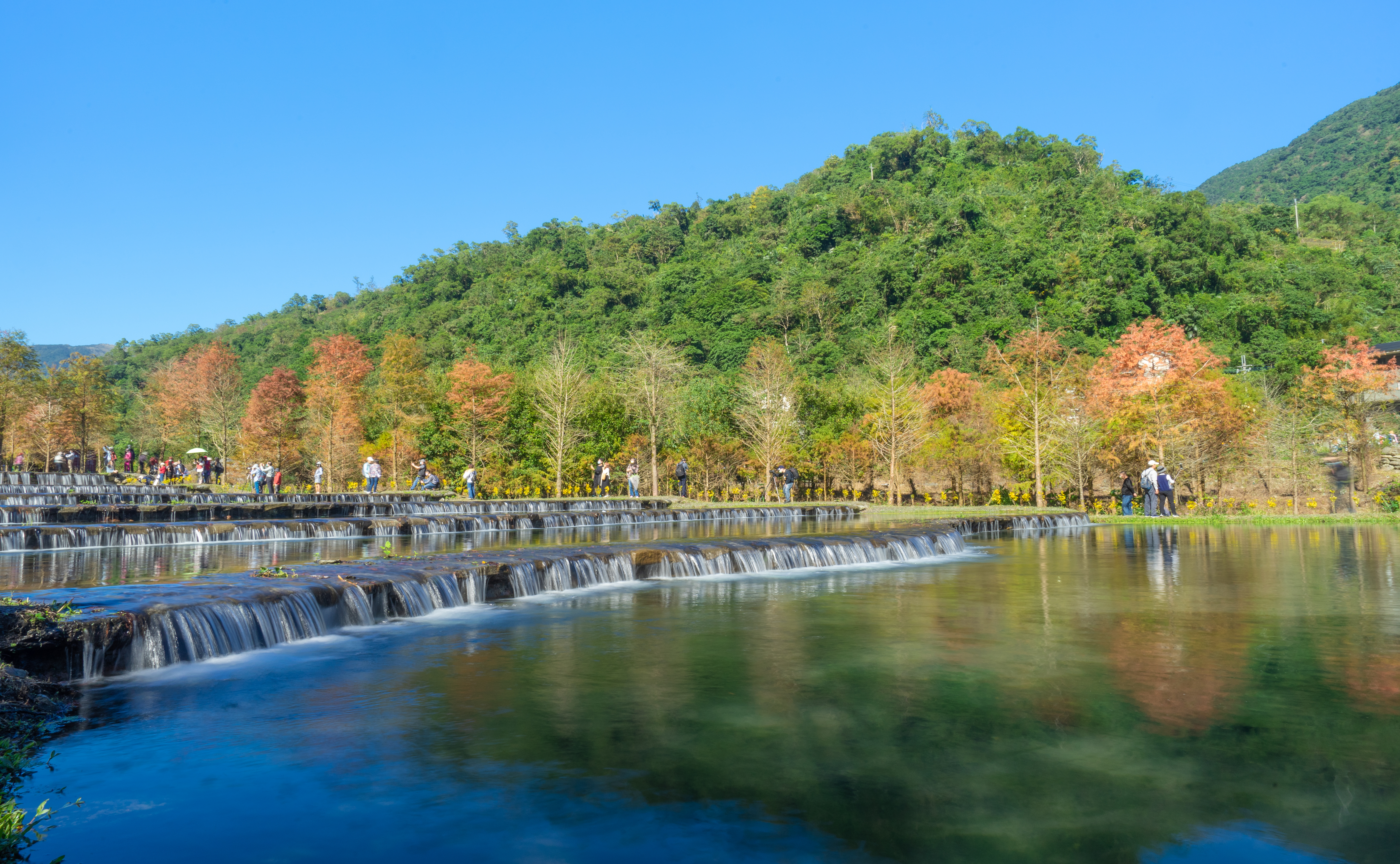 再加上在水塘週圍又種滿了落雨松林 到了12月正是轉紅最美的季節讓原本就已經很美的水塘 更加的夢幻美麗了! 清澈翠綠的階梯瀑布壯觀磅礴,相當療癒 走訪沿途能欣賞茂密的落羽松林 還能走小橋、觀溪流、賞黃楓,生態多變化 美景媲美花蓮雲山水呢,絕對值得一訪